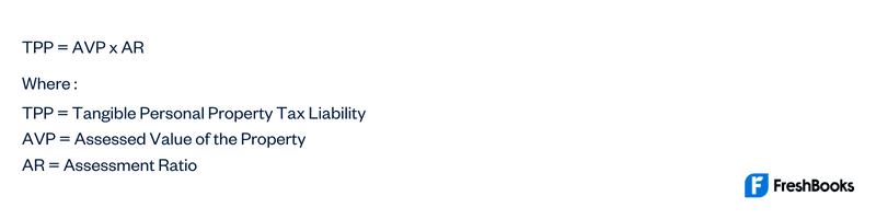 Tangible personal property tax liability can be calculated by first figuring out the assessed value of the property. Once you have done that, you multiply it by the assessment ratio that comes with that property class.
