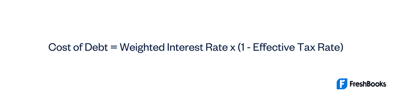 At a basic level, the cost of debt formula is total interest divided by total debt. Total interest / total debt = cost of debt. You use this formula for each individual debt you owe. Many businesses choose to calculate the weighted cost of debt. This is the average interest across all of your outstanding debts.