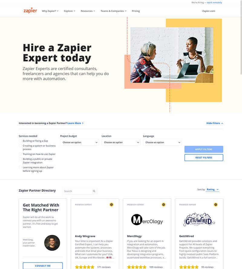 You can also set up a community for your customers, give them a chance to become a brand ambassador, and create opportunities to help your customers’ businesses grow. For example, some companies display their experts or customers on a page where someone who wants to work with them can reach out: