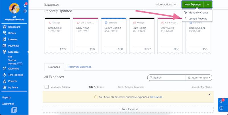 - From the Expenses tab on your Dashboard, click “New Expense” and select “Upload Receipt”.