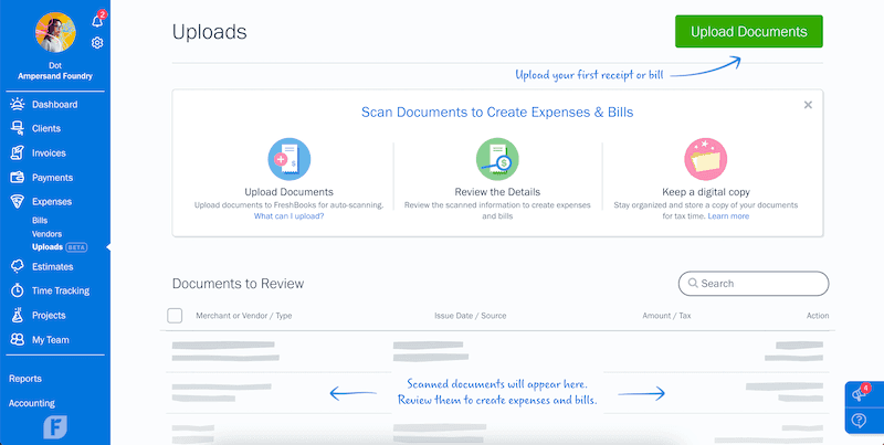 Note: Your newly scanned receipts will be housed in your Uploads page. Once you’ve reviewed the data, the documents will be moved into the Expenses or Bills section.