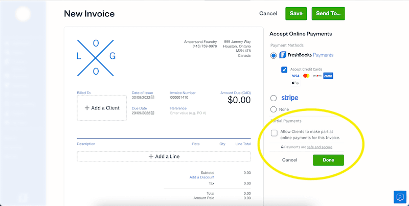 Then you might want to consider the Partial Payment option on your next invoice. It allows you to get paid a percentage upfront – acting as a security measure against not getting paid for your work once it’s completed. And it gives you the option of offering customers a bit of added payment relief if they need it. It’s available on FreshBooks Payments powered by Stripe and PayPal for all payment types.