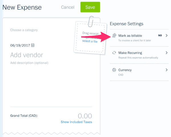 - Click on Expenses in the left menu and select an existing expense or create a new one. Then, mark the expense as billable.