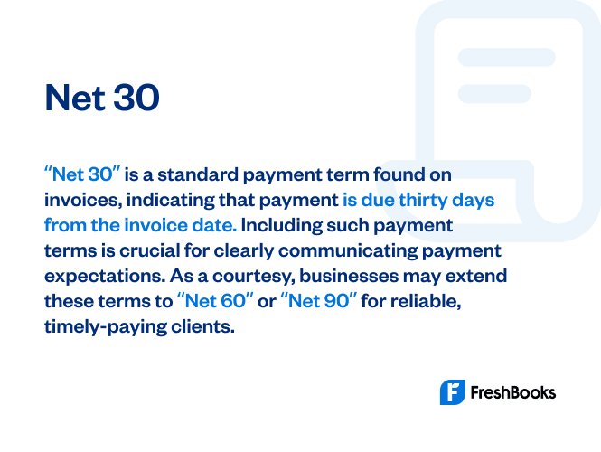 Net 30 is a term included in the payment terms on an invoice.