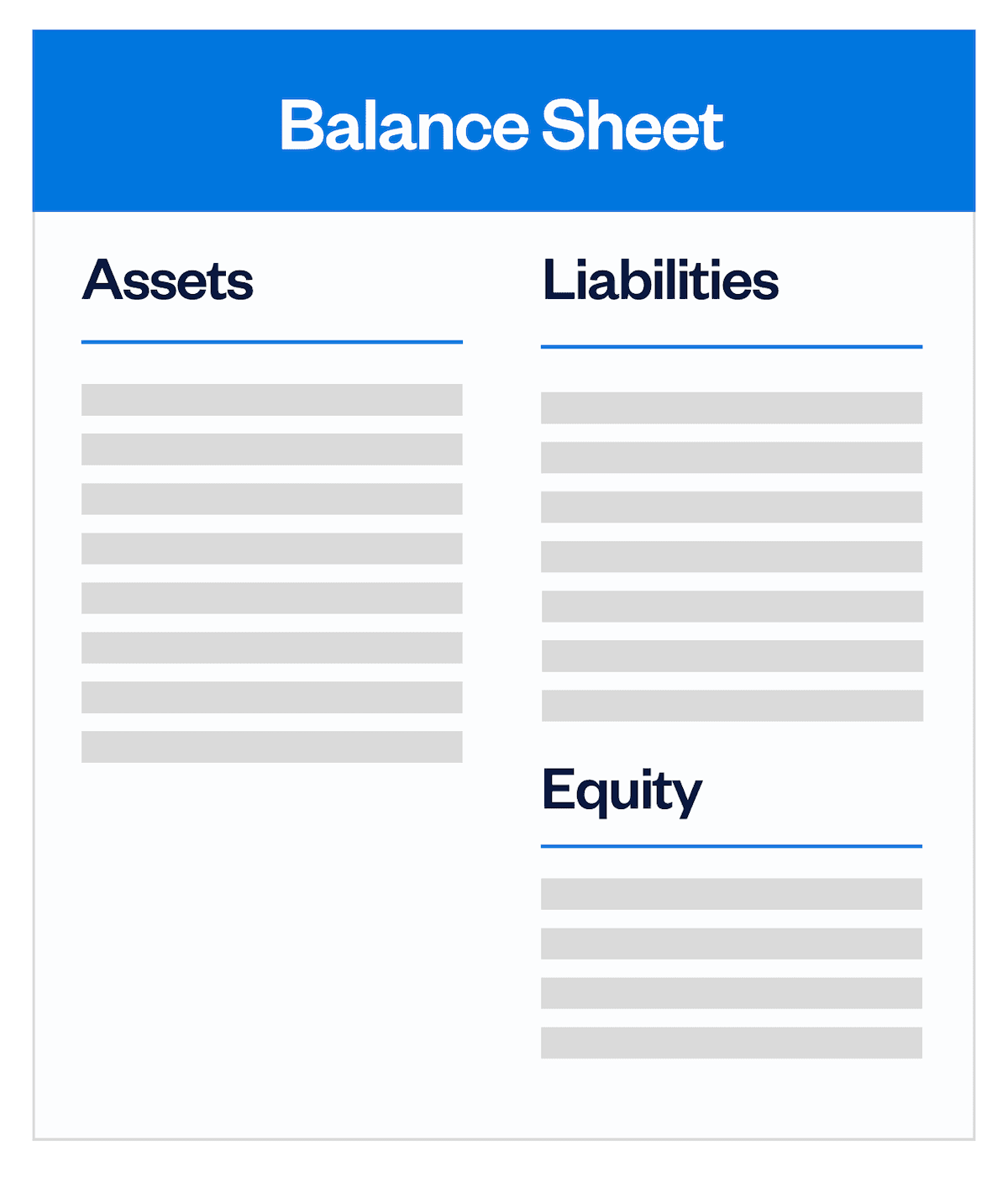 Your balance sheet is split up into three parts: assets, liabilities, and owner’s equity (or shareholders’ equity, for partnerships and LLCs). The conventional layout is to have your list of assets on the left, or at the top. And your liabilities and equity on the right, or on the bottom.