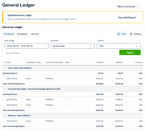 A complement to the Trial Balance report, the General Ledger helps verify that all categories and parent accounts are balanced. Plus, you can adjust date range filters to match the report with your bank statements, making reconciliation easier.